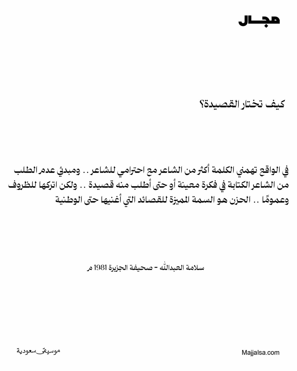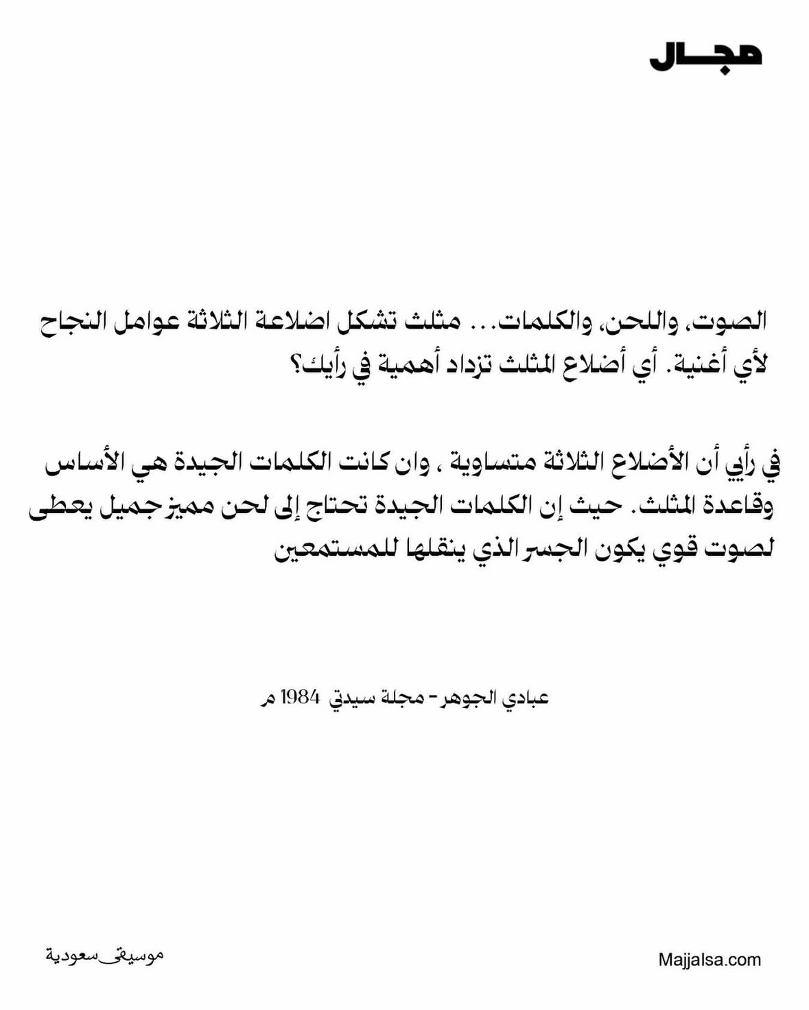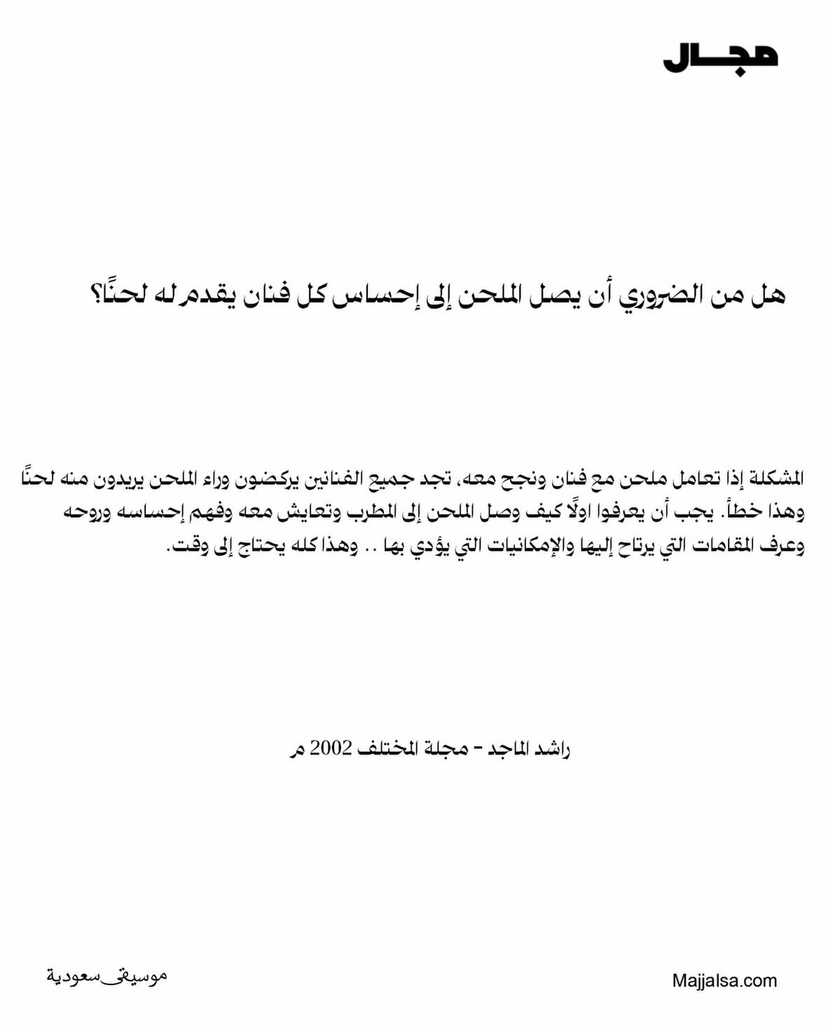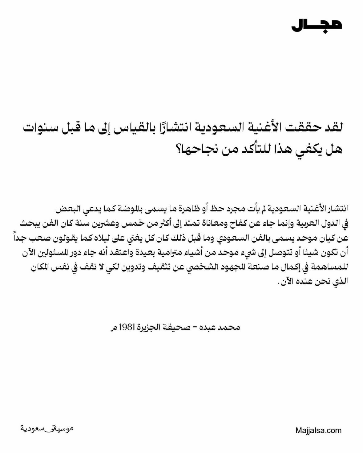أرشيف منشورات مجال أرشيف فيدوهات مجال أحدث القوائم التشغيلية أغاني من كلمات مساعد الرشيدي عبدالمجيد عبدالله بألحان سراج عمر المزيد من القوائم أحدث المقالات والحوارات مقالات وحواراتعن جدليَّة اختفاء الفنان في المنطقة الوسطى!مقالات وحواراتمحمد العبدالله الفيصل : أنا مستهلك للكلمةمقالات وحواراتعدم وجود فرع للجمعية بالقصيم وحائل .. يتسبب في موت البراعم قبل انفتاحها!مقالات وحواراتحديث مع الفنان المثقف فوزي محسون المزيد من المقالات والحوارات